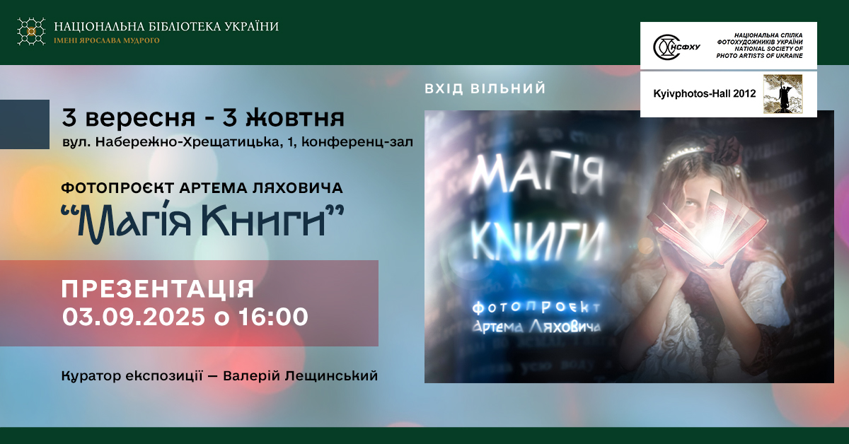 З 03 вересня по 03 жовтня 2025 року в Національній бібліотеці України імені Ярослава Мудрого за адресою: вул. Набережно-Хрещатицька, 1, конференц-зал експонуватиметься фотовиставка Артема Ляховича «Магія книги».