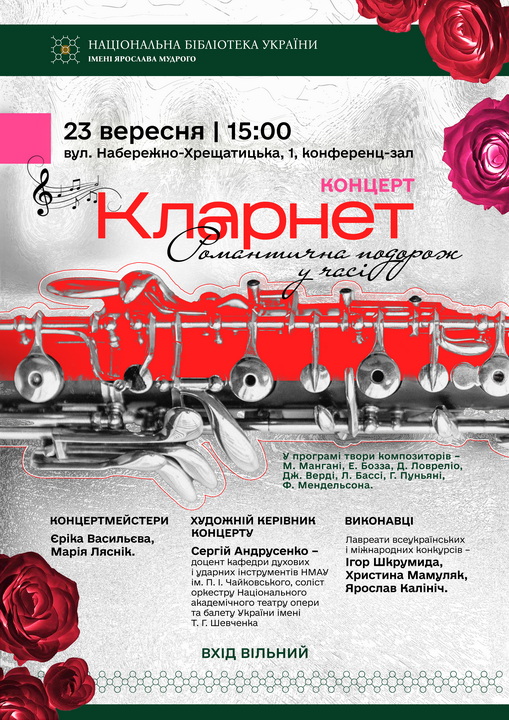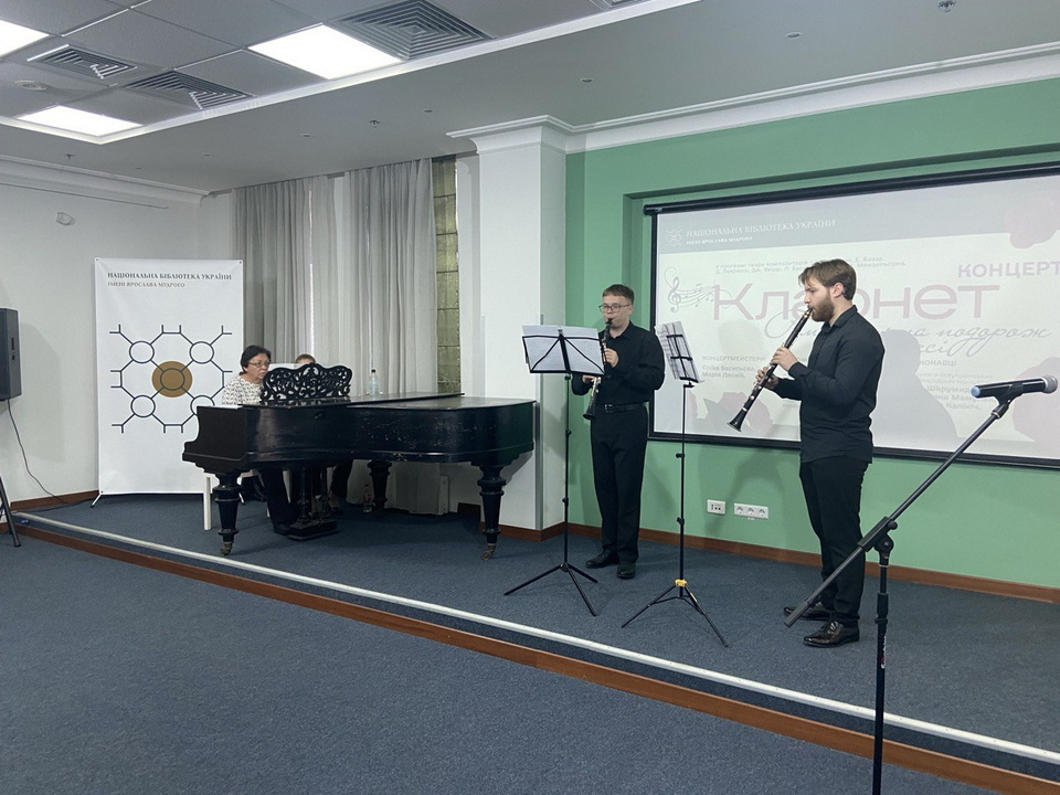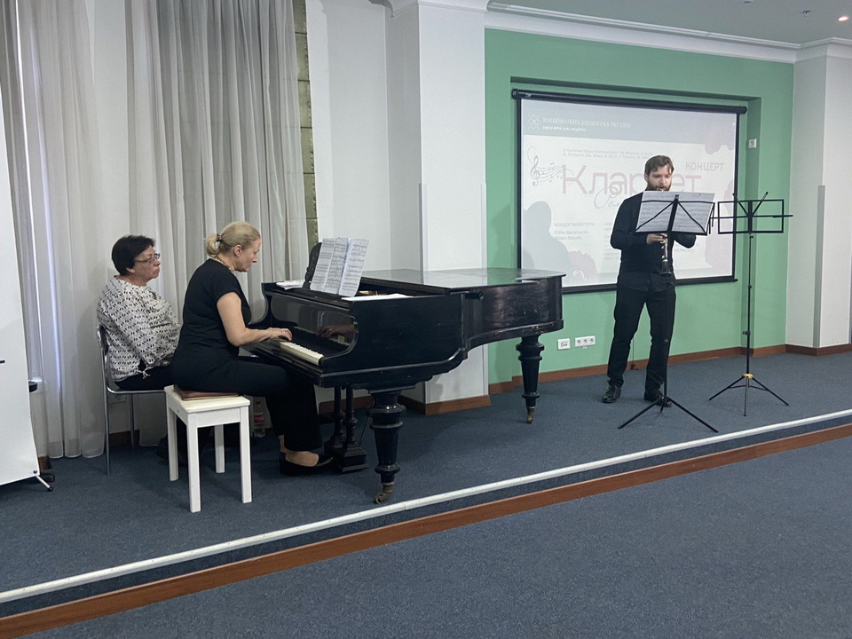 23 вересня у Національній бібліотеці імені Ярослава Мудрого відбулася подія, яка наповнила залу чарівністю музики – концерт «Кларнет. Романтична подорож у часі». Це була мить справжньої магії, коли музика перетворилася на натхнення, ніжну романтику й прекрасний настрій.
