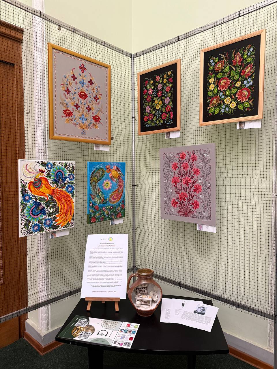 До уваги відвідувачів - класичні композиції і натюрморти, у яких квіти наповнені глибокою символікою петриківської традиції: барвінок як знак вічності, калина - образ рідної землі та жіночої долі, квіткове розмаїття символ гармонії, краси й невичерпної сили природи.